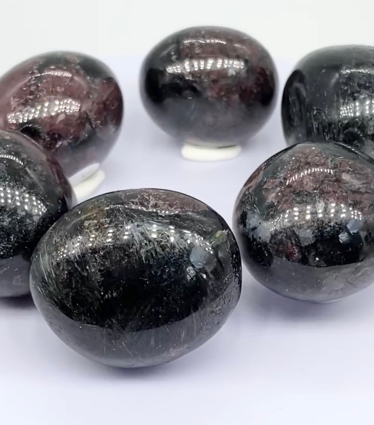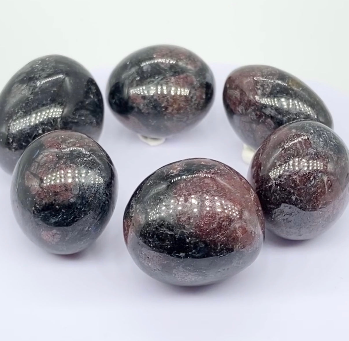 These Arfvedsonite and Red Garnet tumbles have the dominant colour of Red Garnet offset with the black rock with subtle Arfvedsonite blades shining through when you catch them at the right angle.