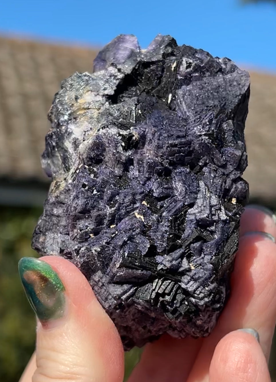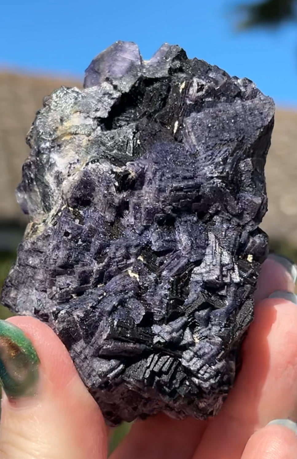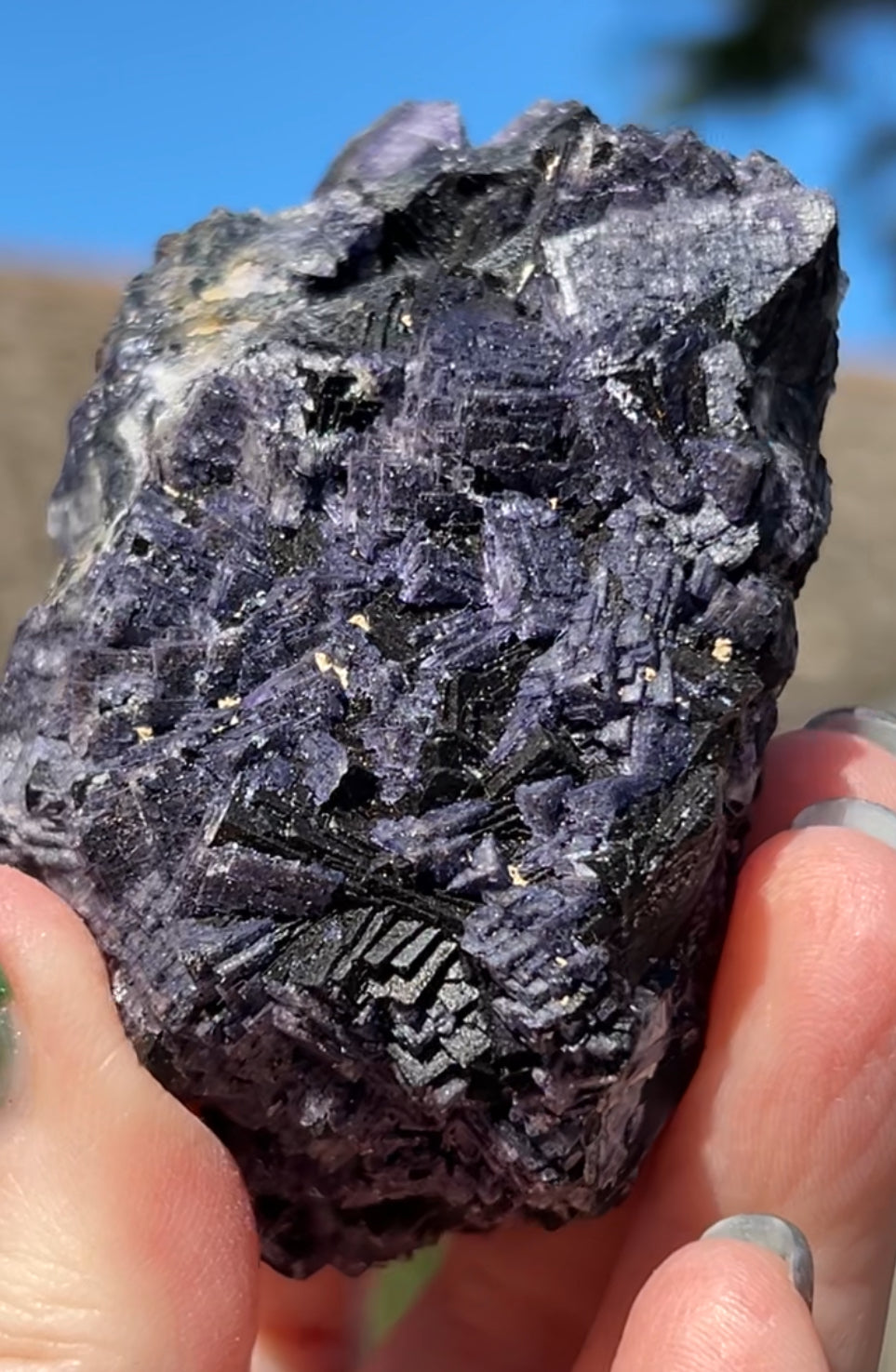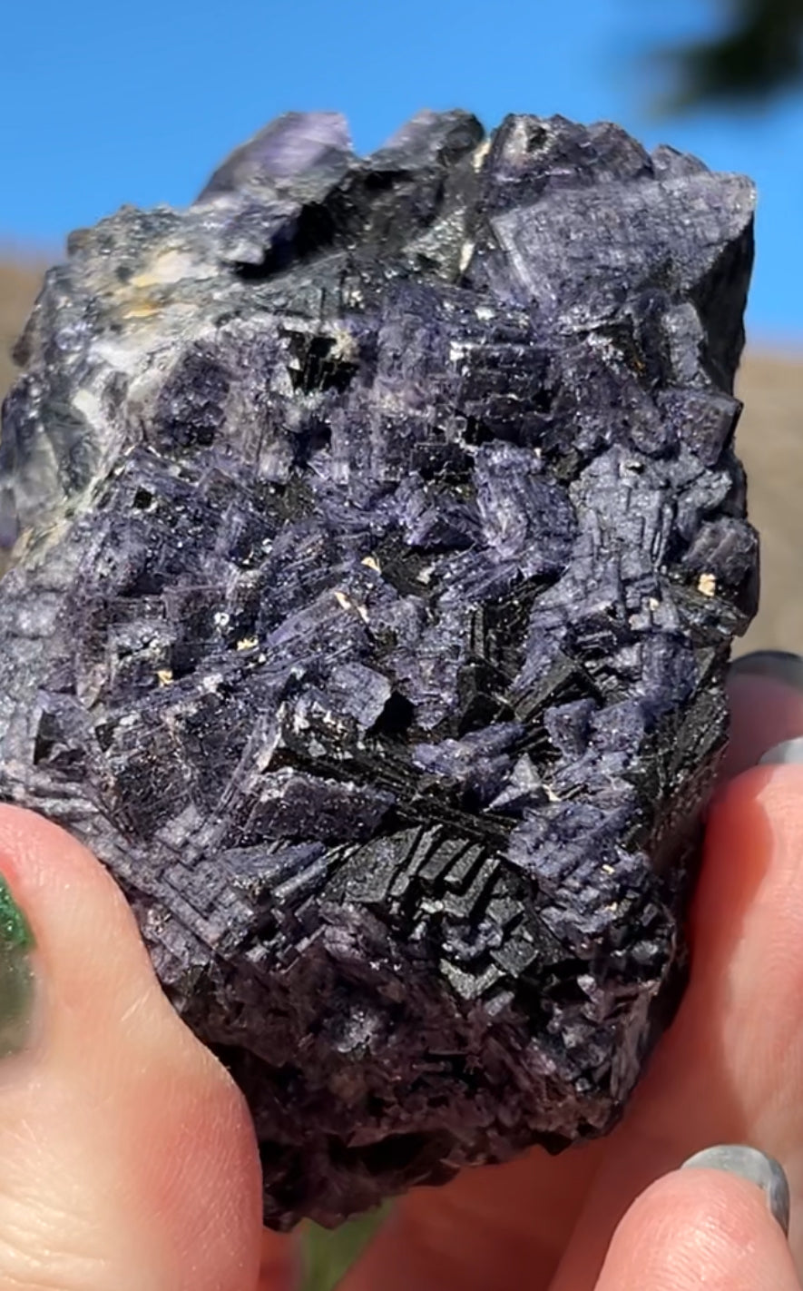 This beautiful specimen is a fine example of Blue John Fluorite with the classic ‘Black Jack’ Black Fluorite, named after the popular Casino game. This specimen is a combination of the darkest blue and darkest purple, giving it the appearance of Black Fluorite.