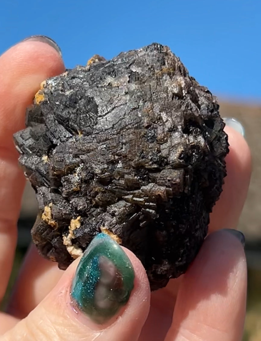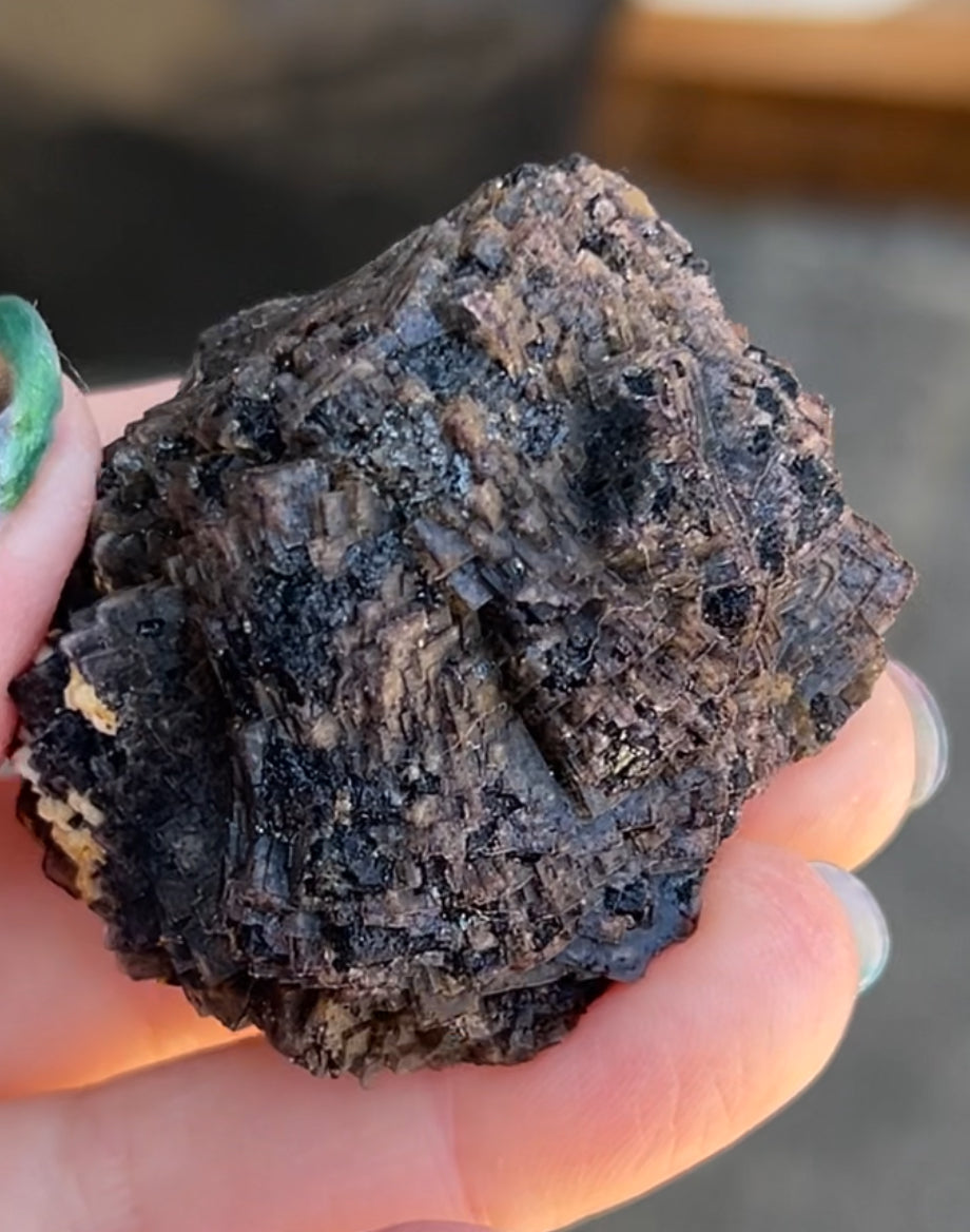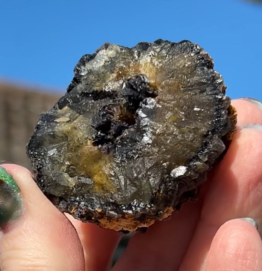 This specimen has a secondary growth of Yellow Fluorite over the top of the Black Fluorite.