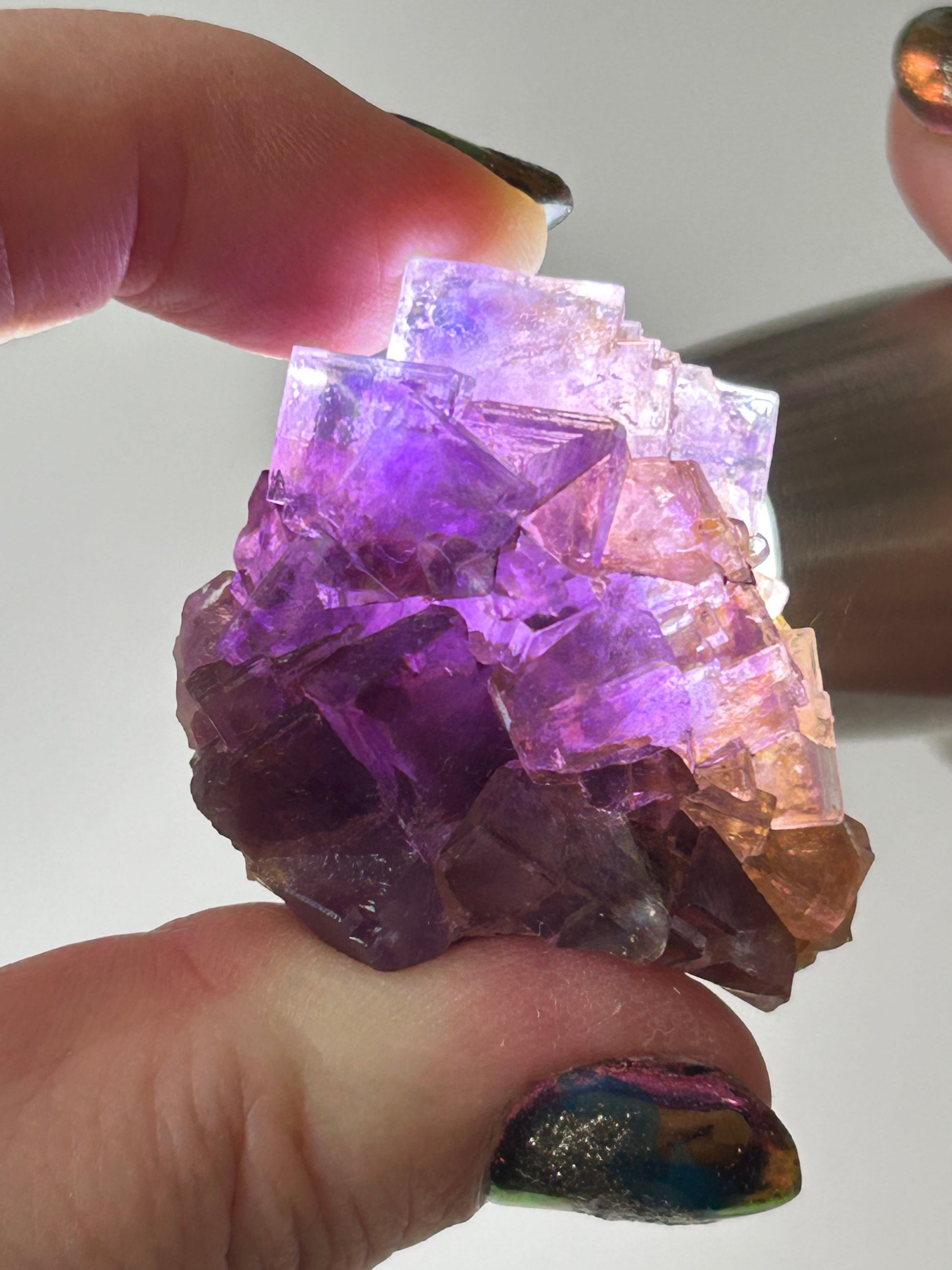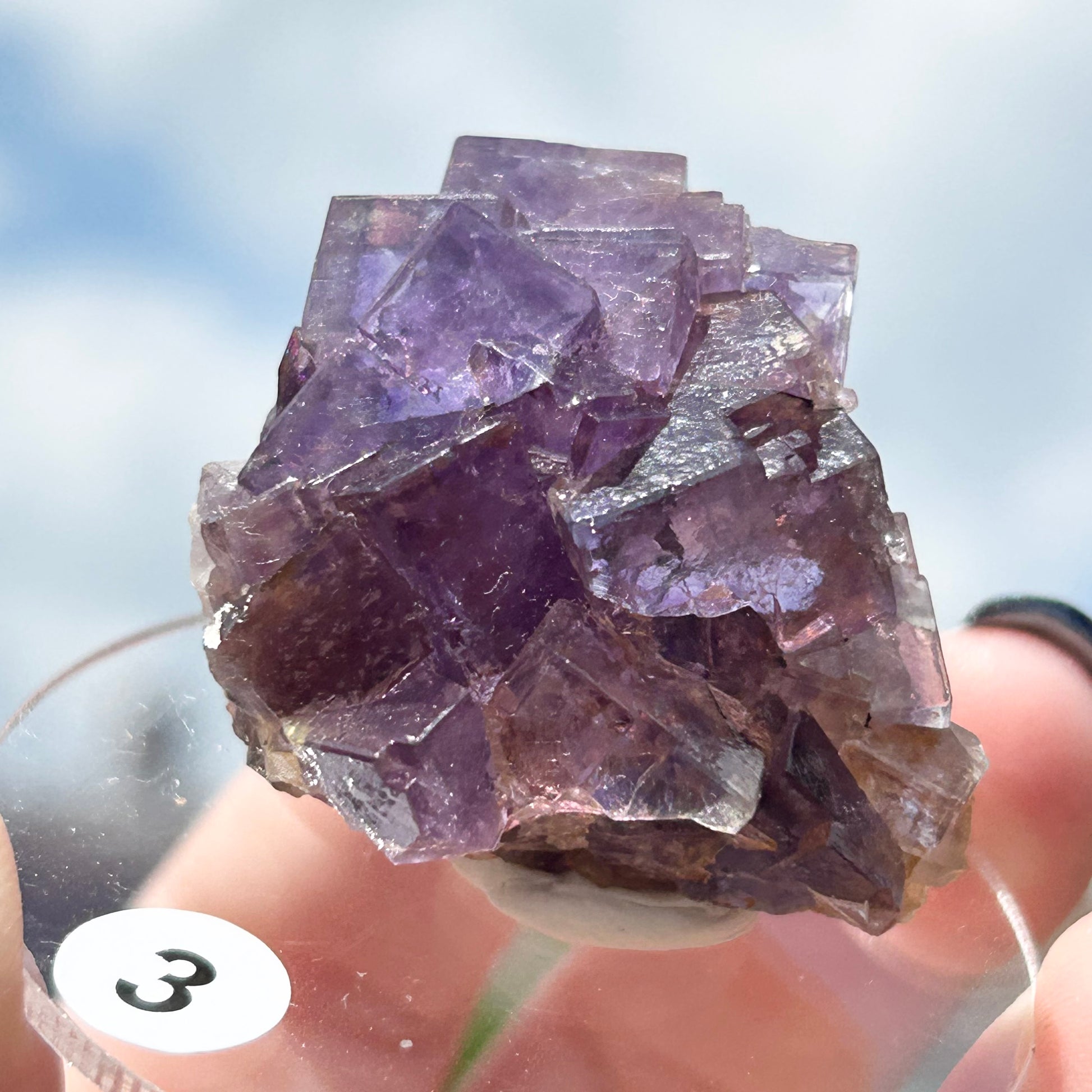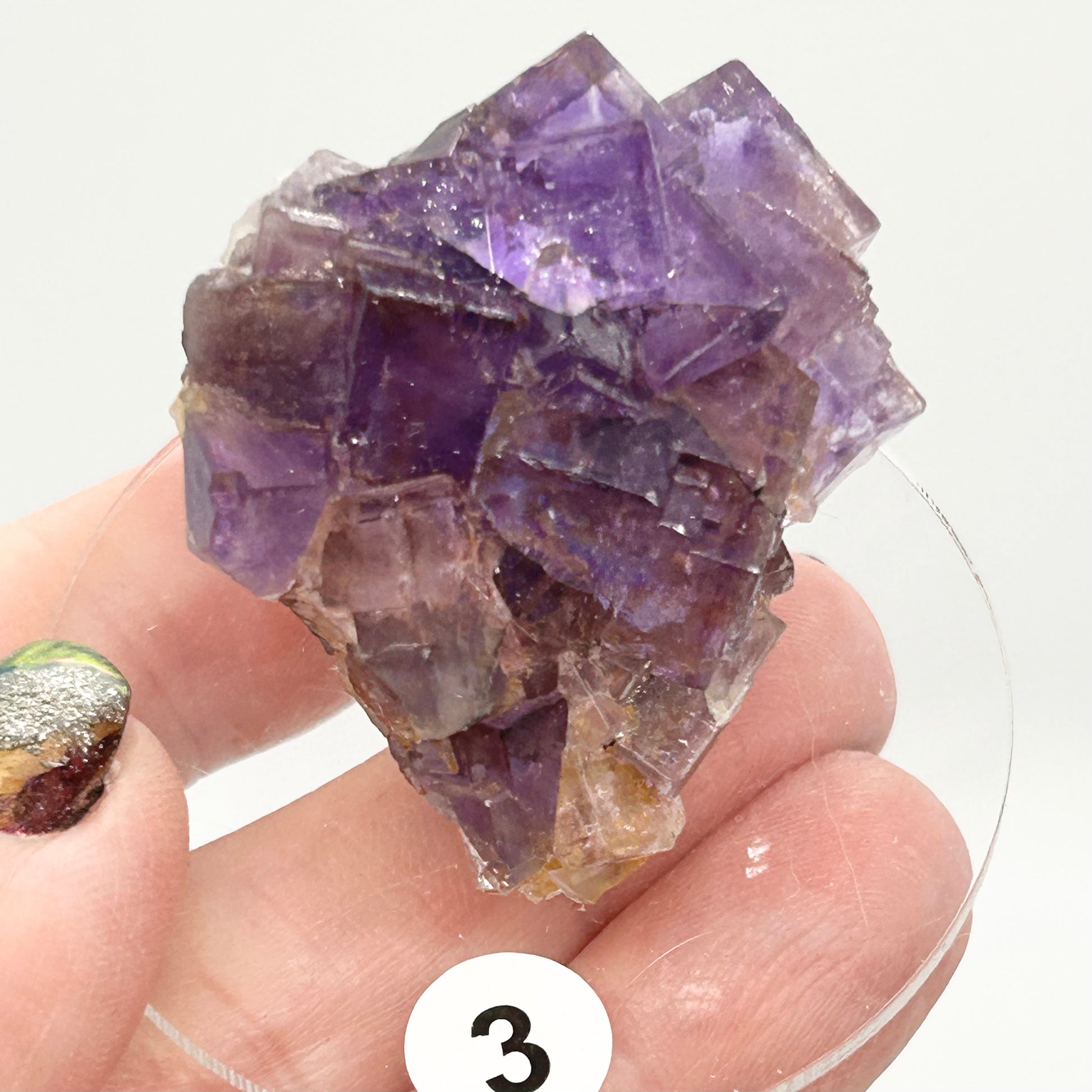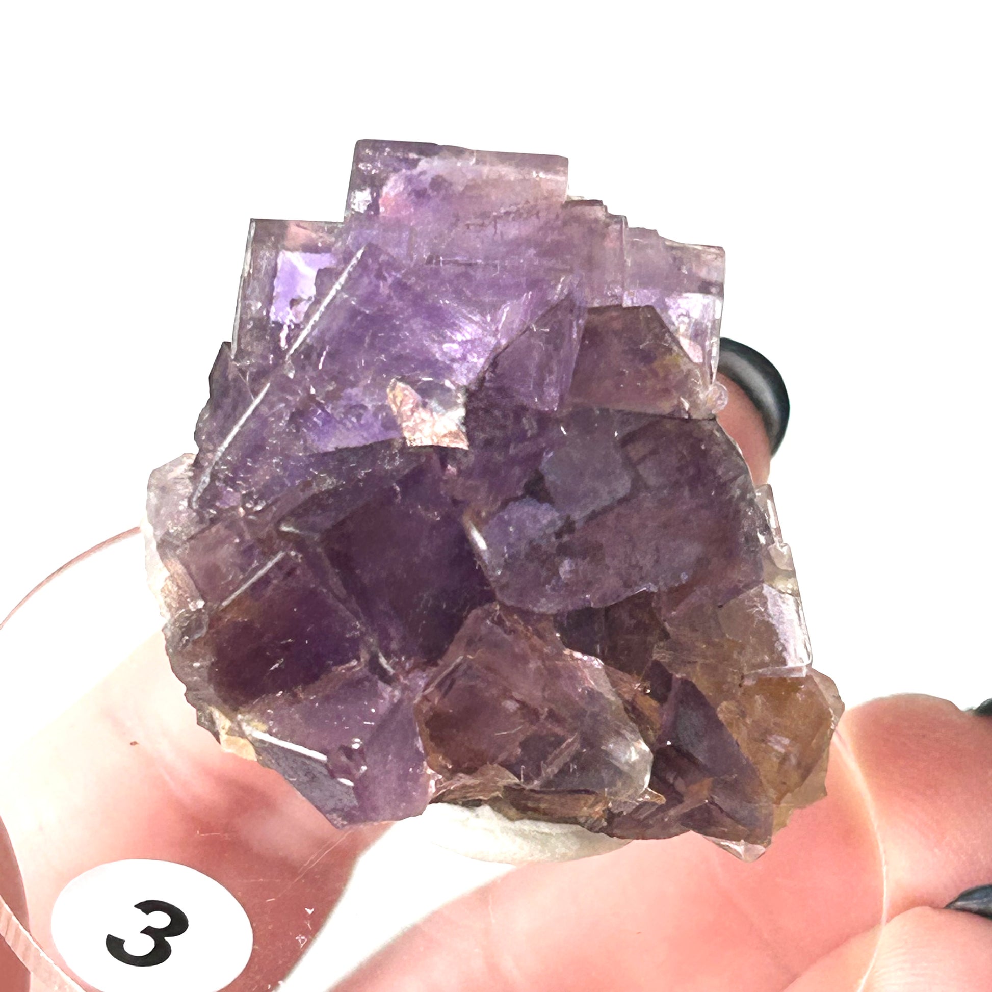 These specimens contain blue and purple zoning, with a beautiful stepped growth pattern.