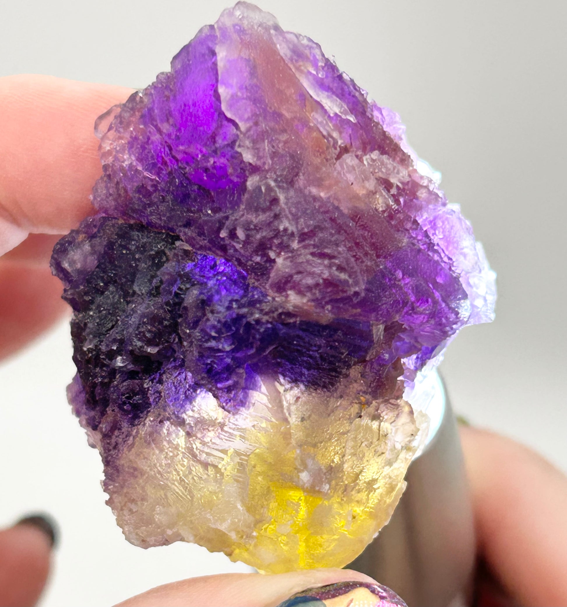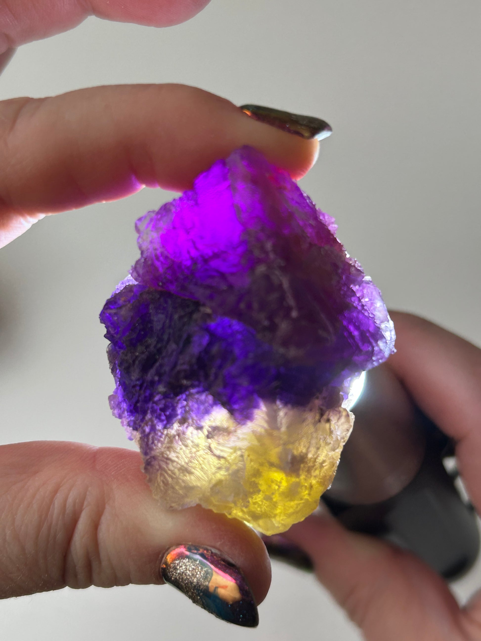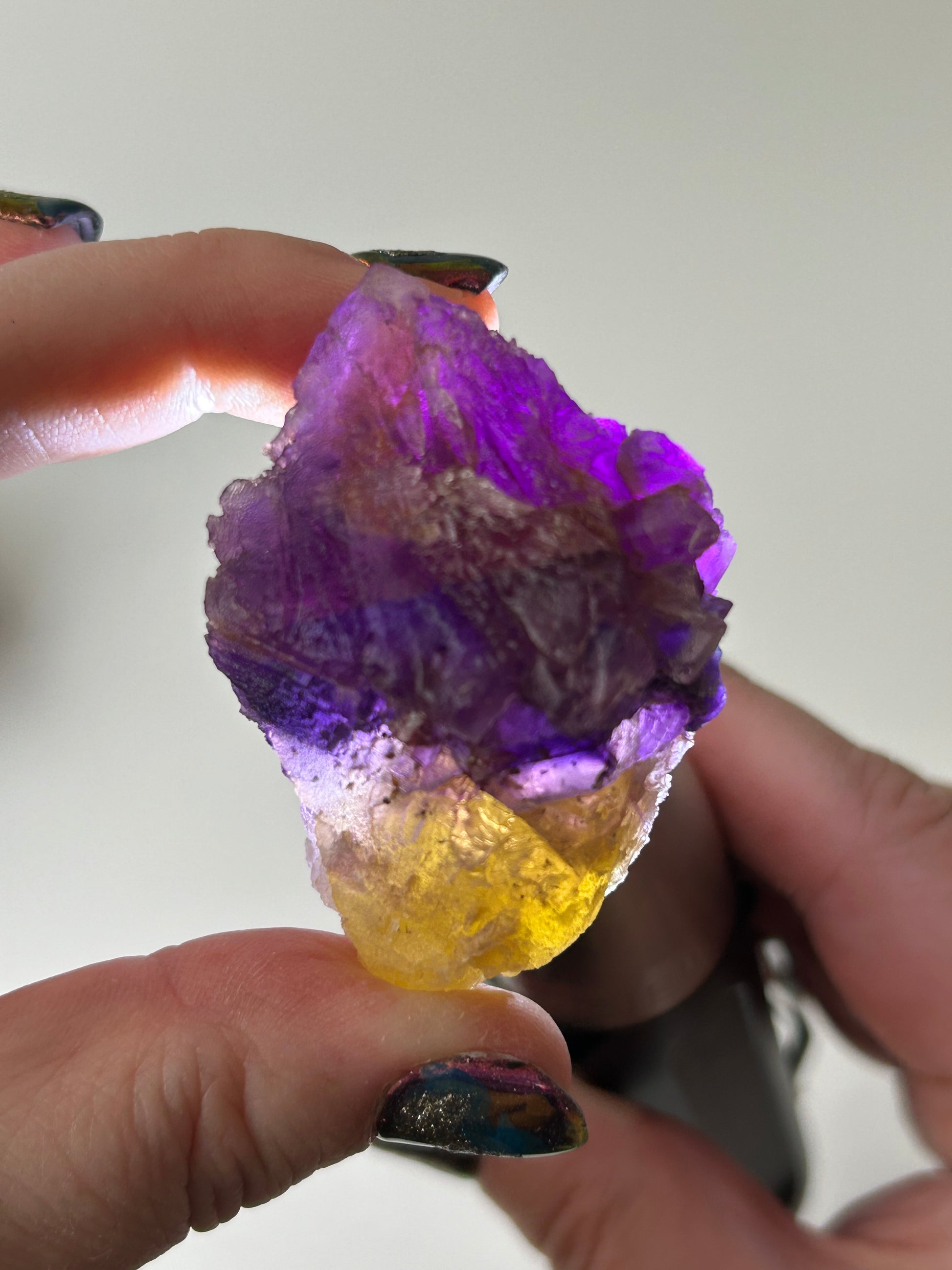 This Blue, Purple & Yellow Fluorite is from the world famous Cave-In-Rock mining area, Illinois, USA 🇺🇸 This Tri colour piece shows the way that after formation Fluorite can dissolve, adding a beautiful and unique pattern to these Fluorites.