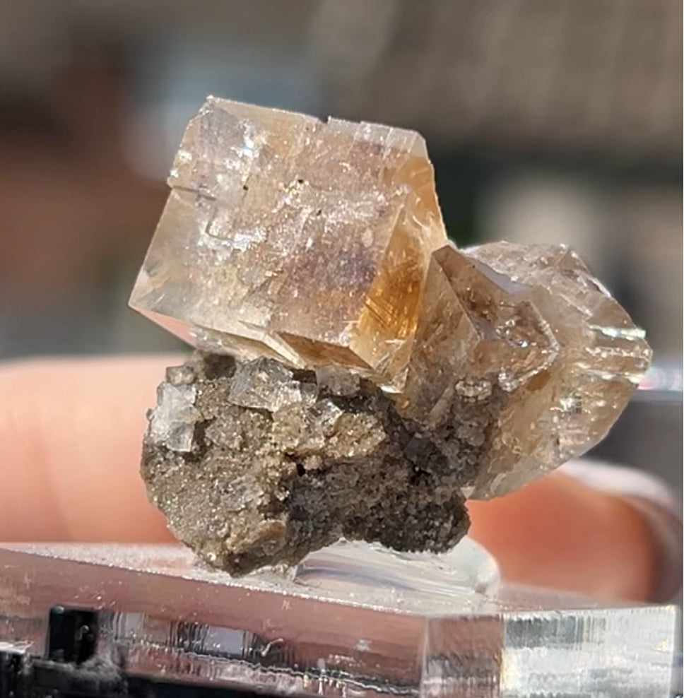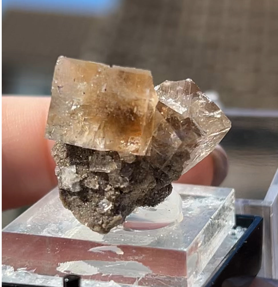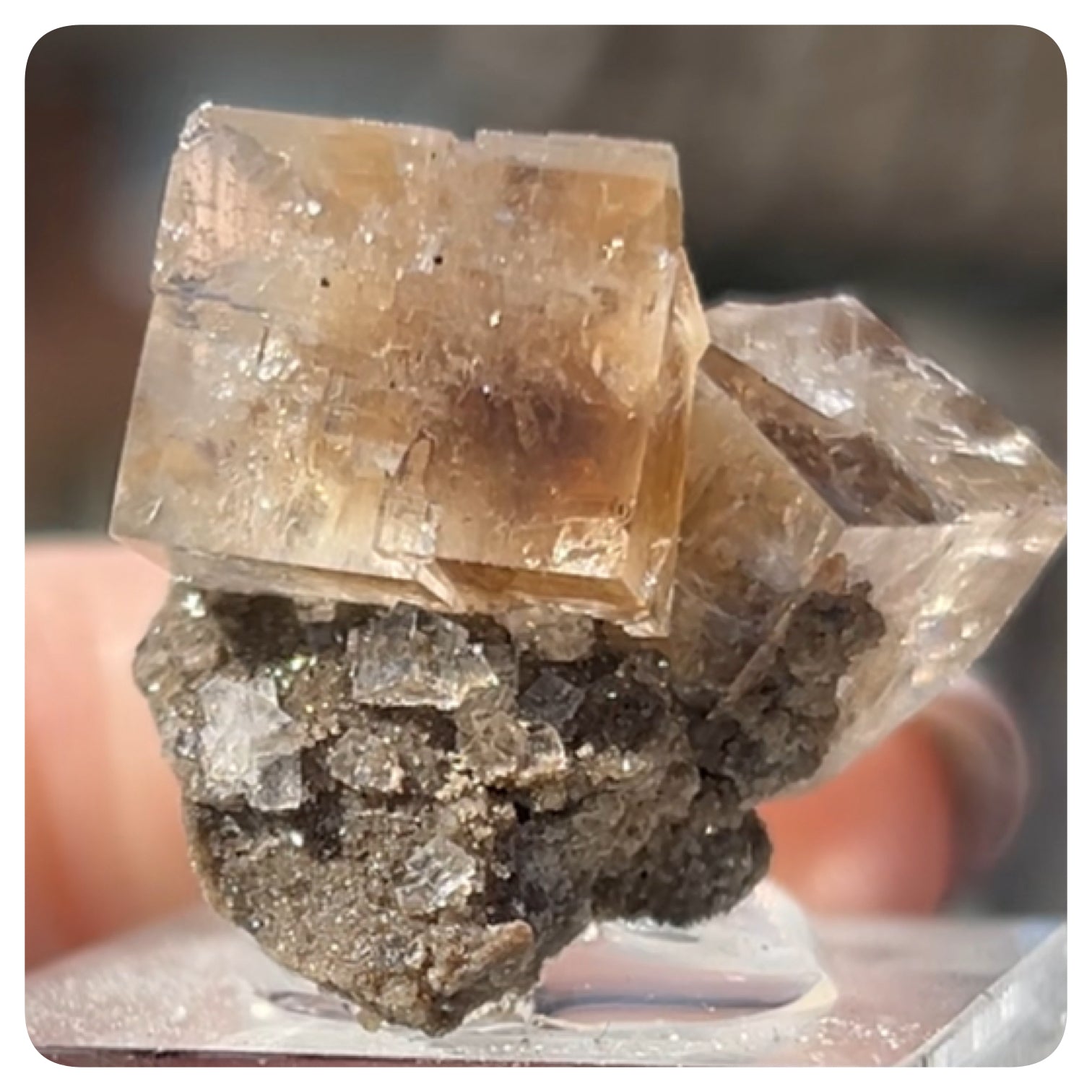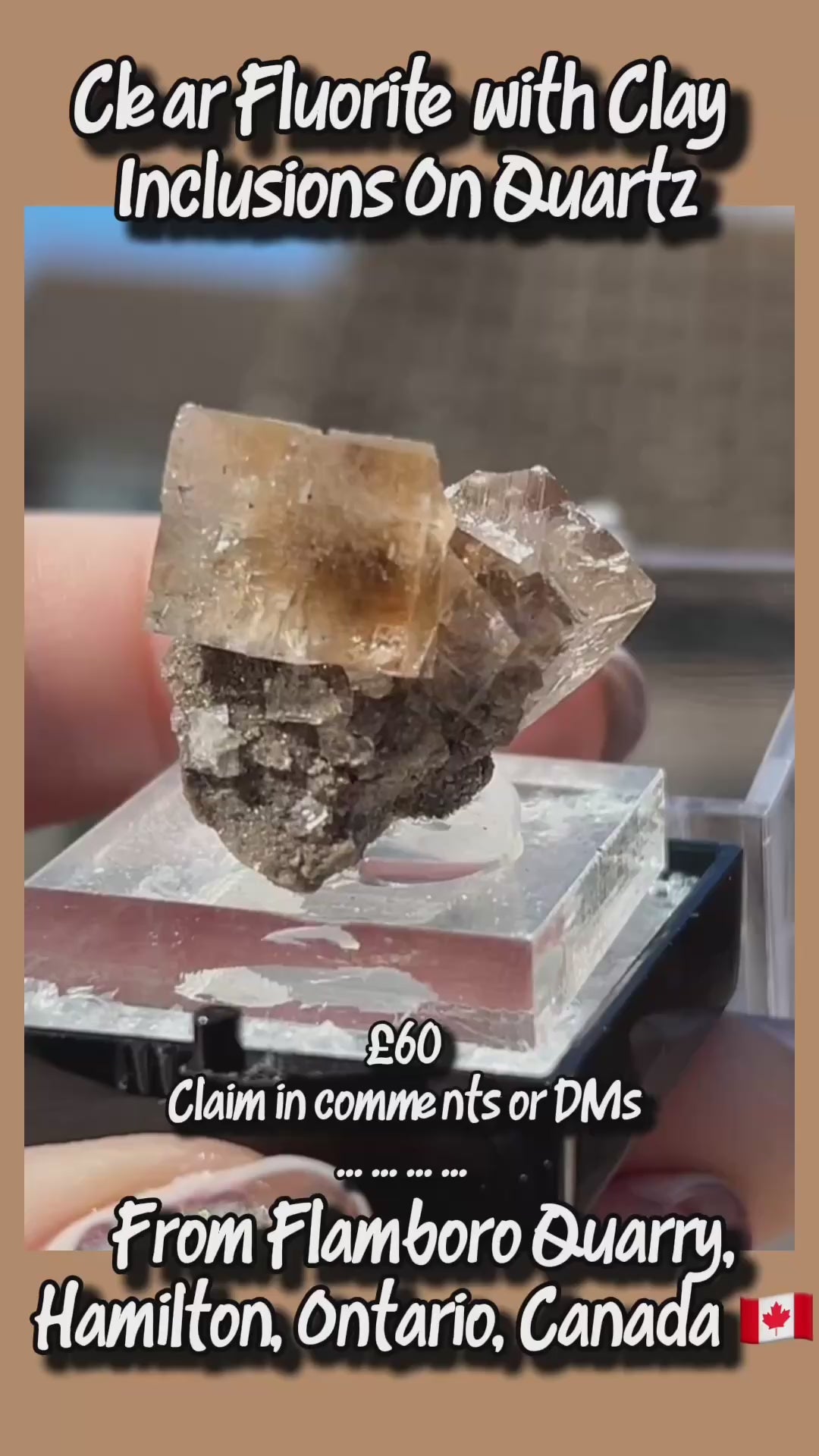This glassy and unique Fluorite was hand mined by a small miner in a Flamboro Quarry in Canada 🇨🇦 The colour of this specimen is from clay inclusions, sitting on a base of Quartz. This miner is no longer able to collect specimens from this location, so we know this as a special and rare specimen.