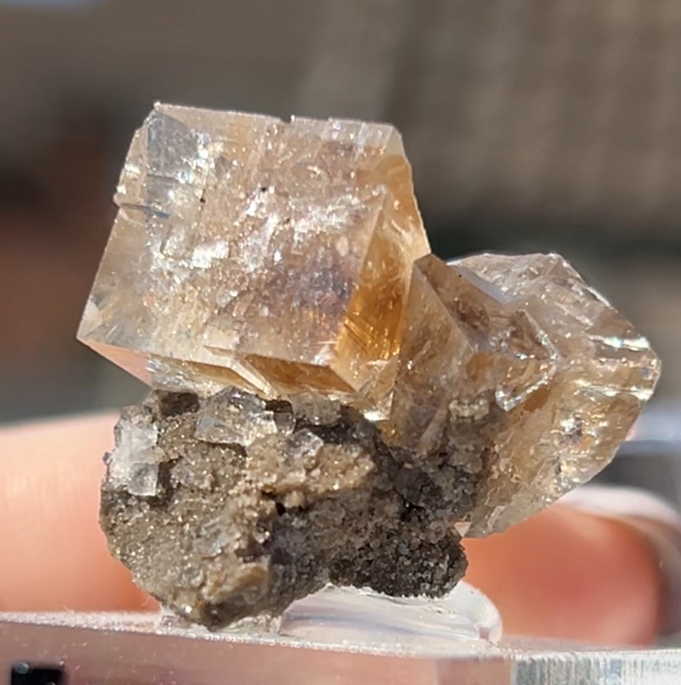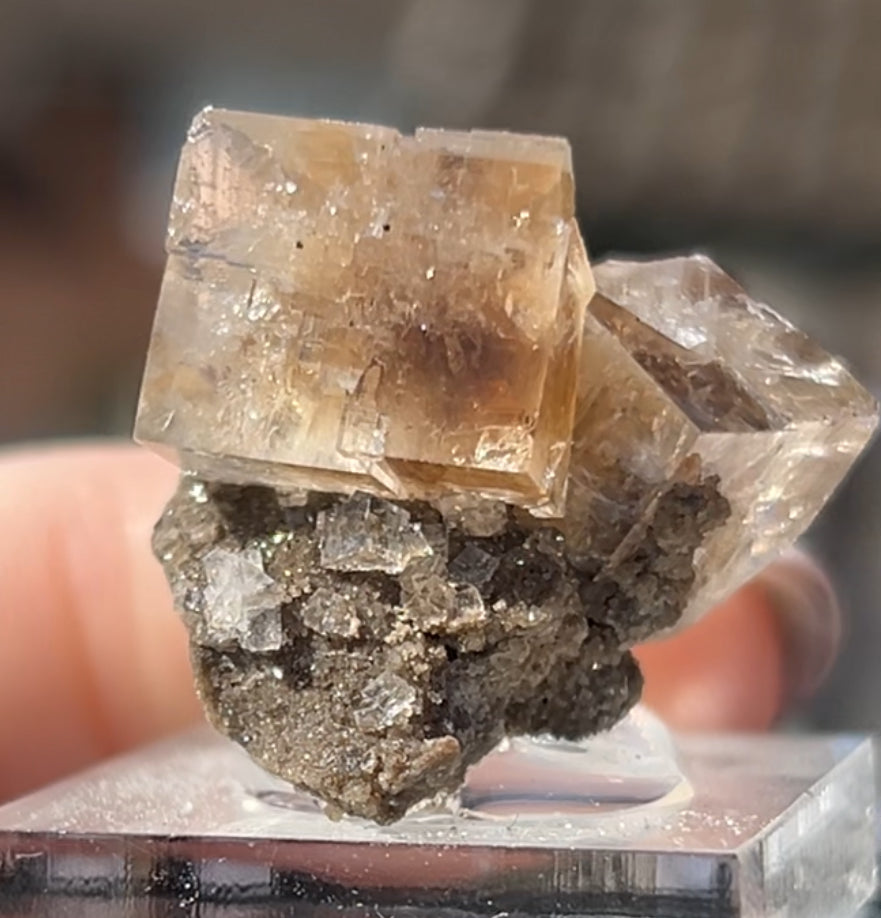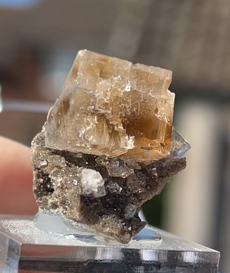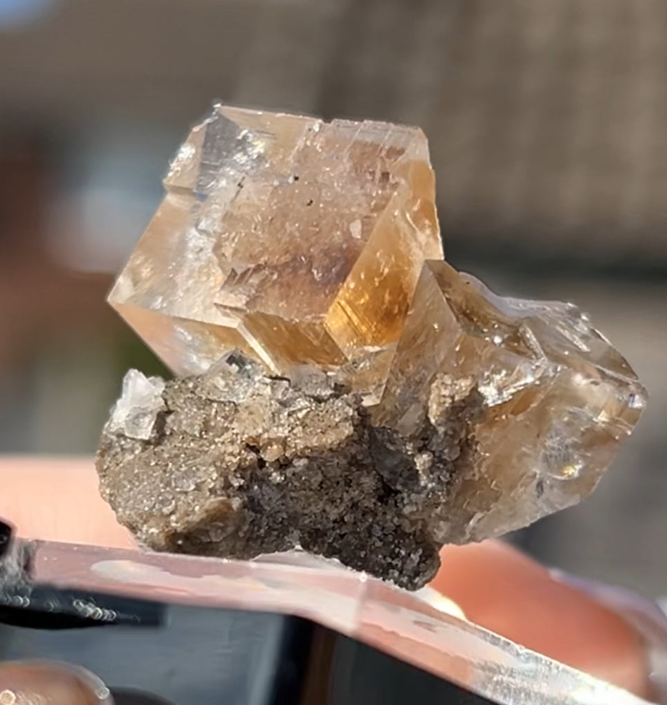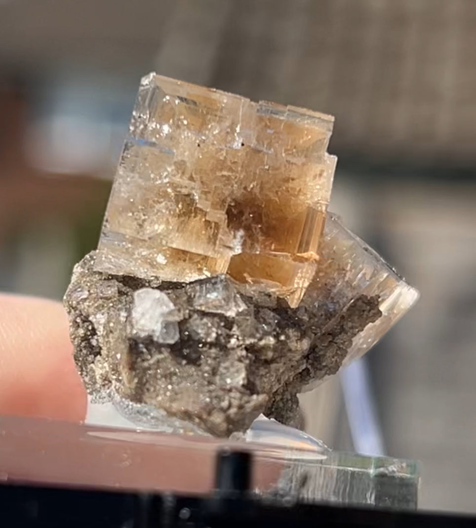 This glassy and unique Fluorite was hand mined by a small miner in a Flamboro Quarry in Canada 🇨🇦 The colour of this specimen is from clay inclusions, sitting on a base of Quartz. This miner is no longer able to collect specimens from this location, so we know this as a special and rare specimen.