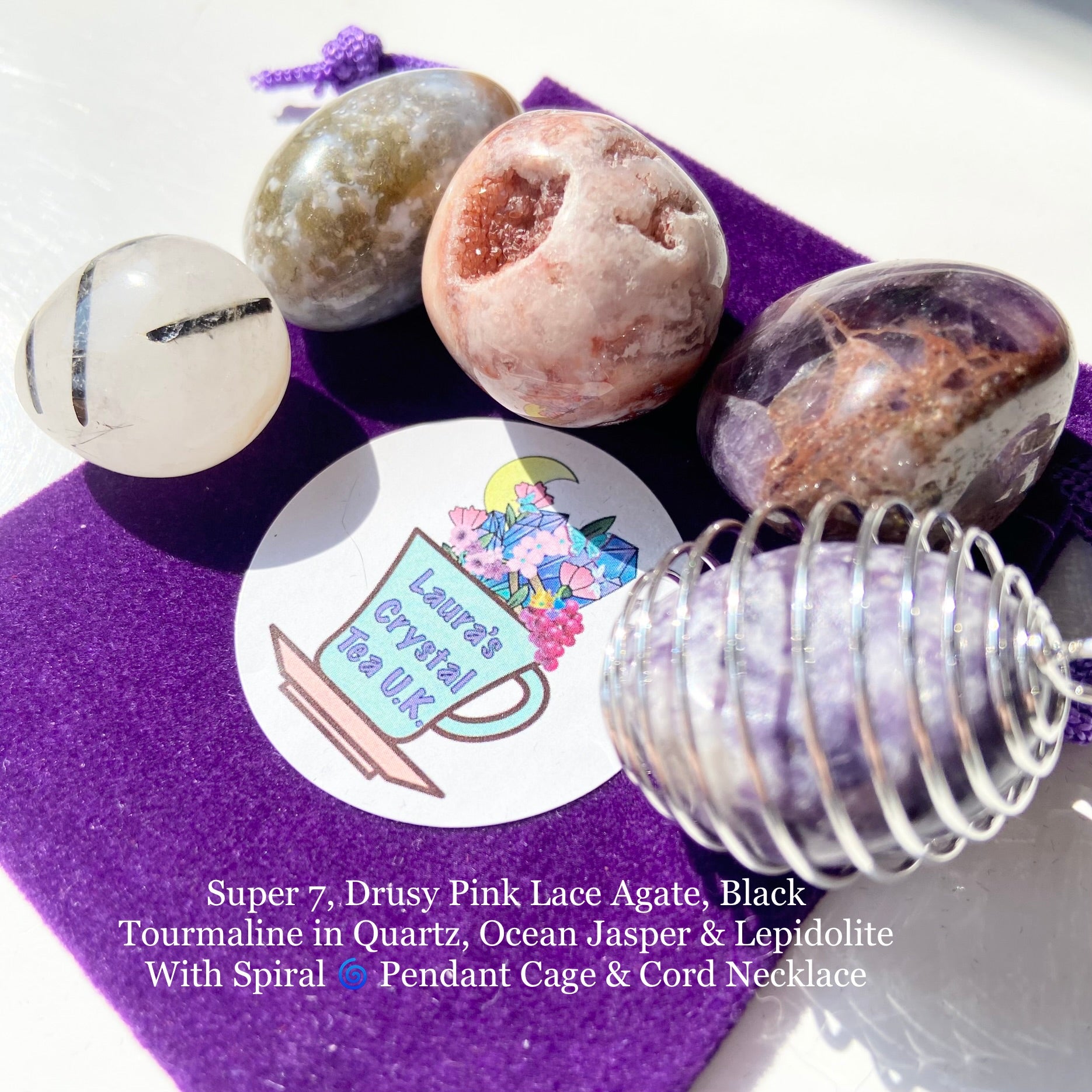 Crystal Gift Bag #16 Super 7, Drusy Pink Lace Agate, Black Tourmaline in Quartz, Ocean Jasper & Lepidolite With Spiral Pendant Cage & Cord Necklace