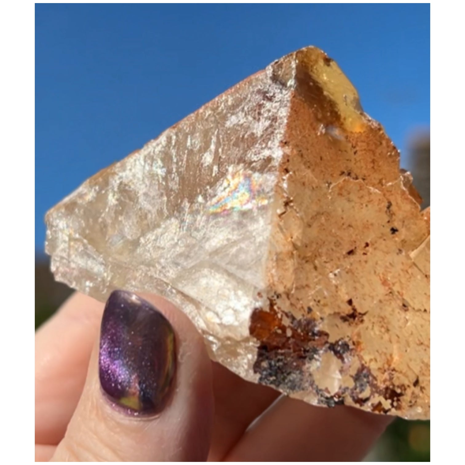 This is a beautifully yellow raw fluorite with a natural iridescent coating of haematite ontop of Goethite. This piece has been cleaved into a pyramid/ triangular shape.