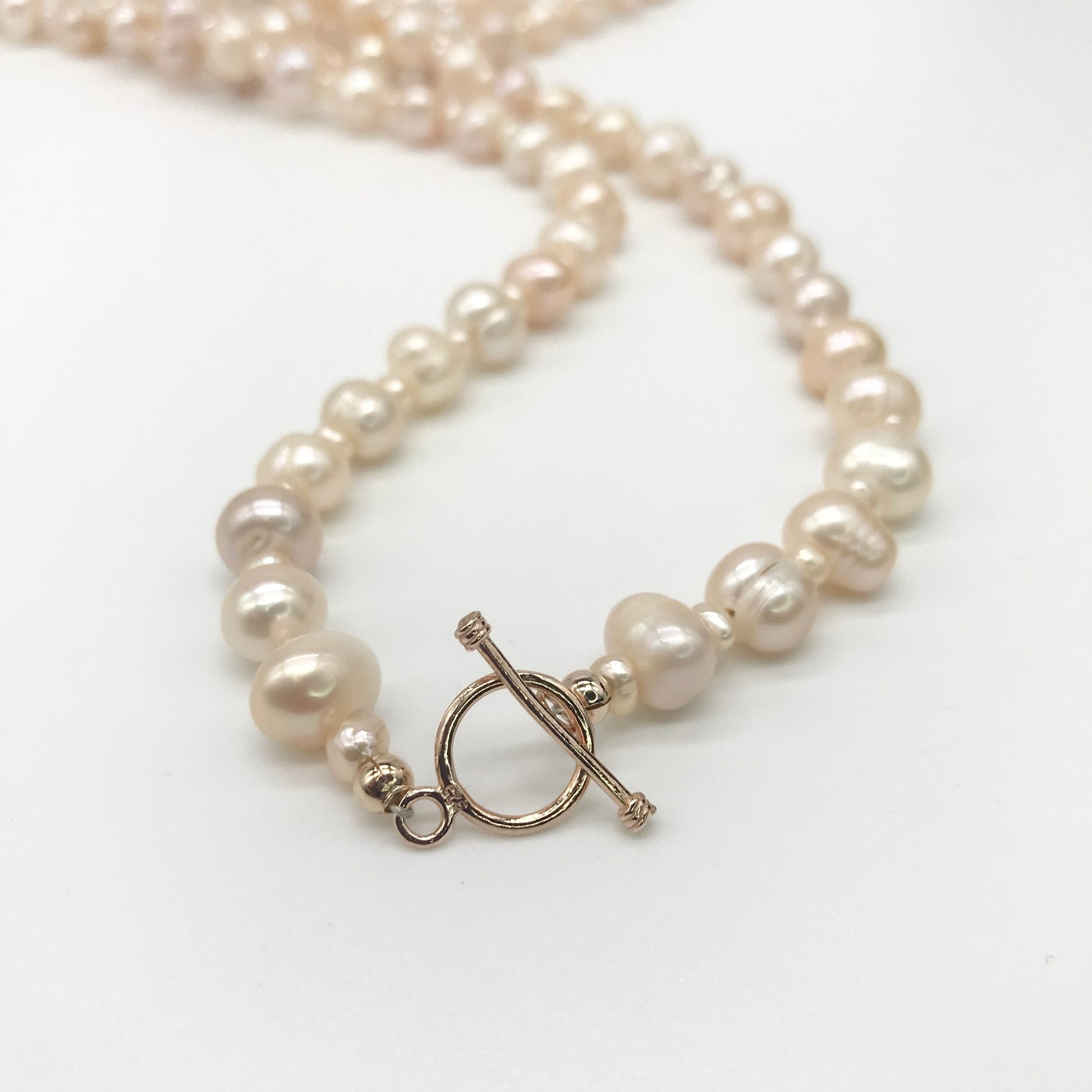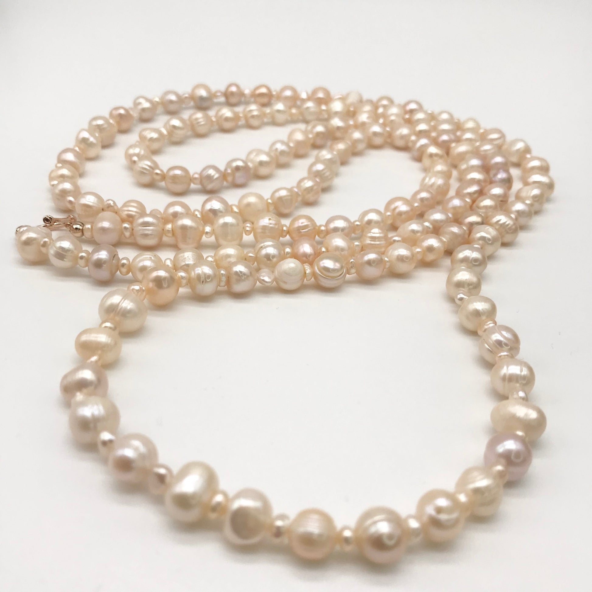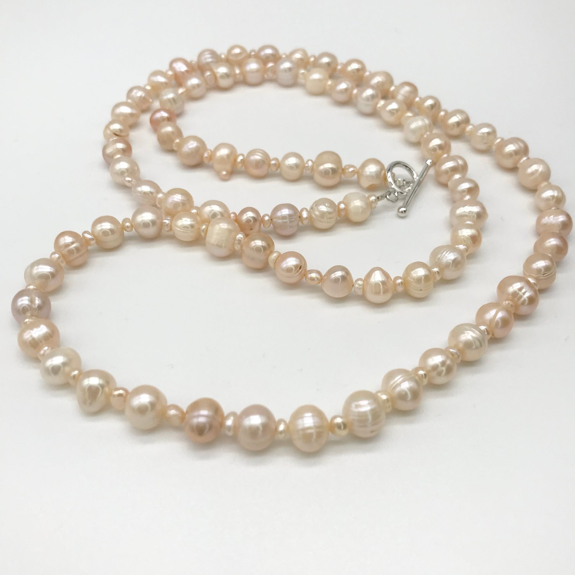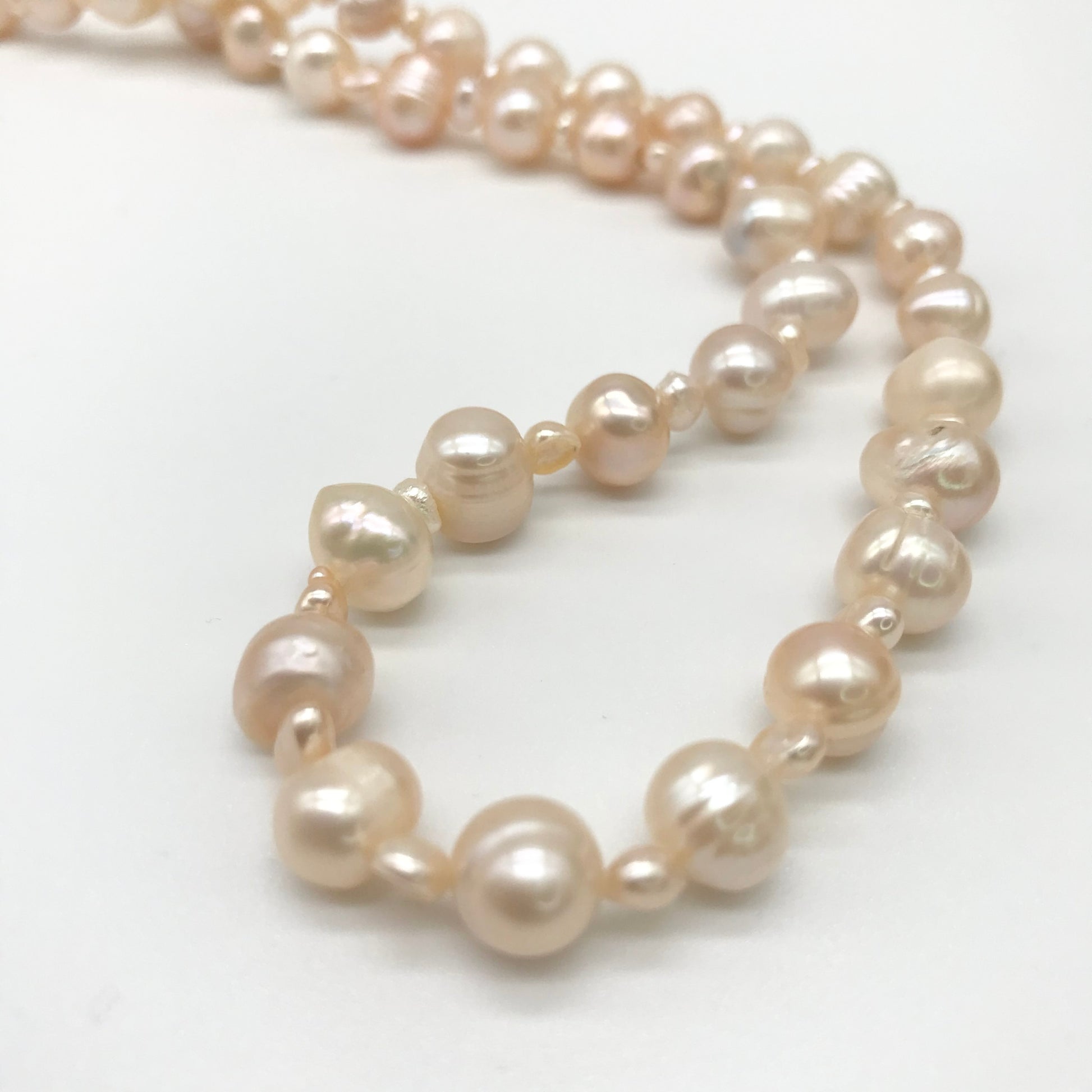 Classic Necklace of Peach Freshwater Baroque Pearls with 925 Sterling Silver Bolt Ring Clasp.
