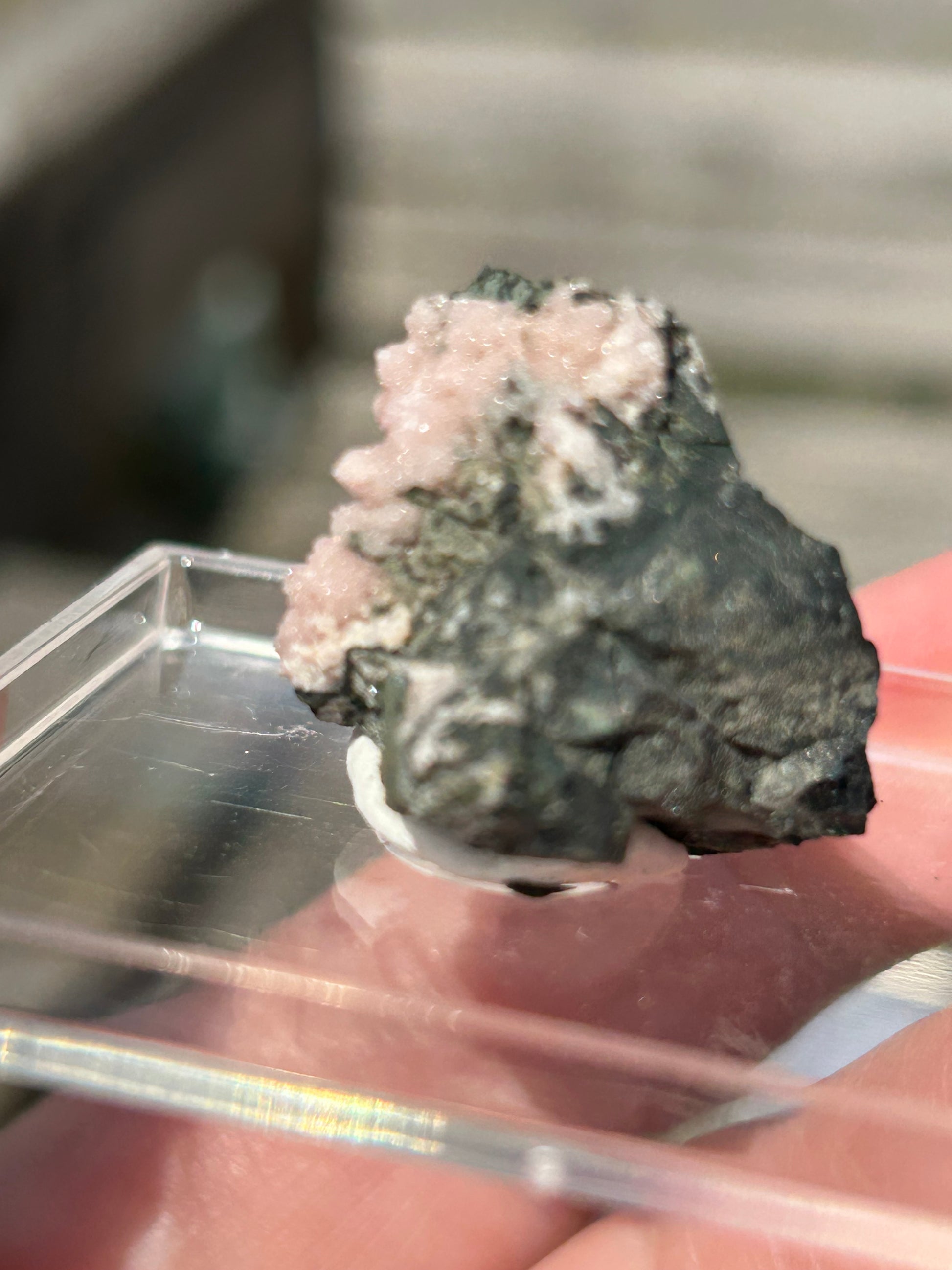 This specimen has Botryoidal Pink Rhodochrosite bubbles all over. This is a true collectors piece is supplied in a specimen box with information card.