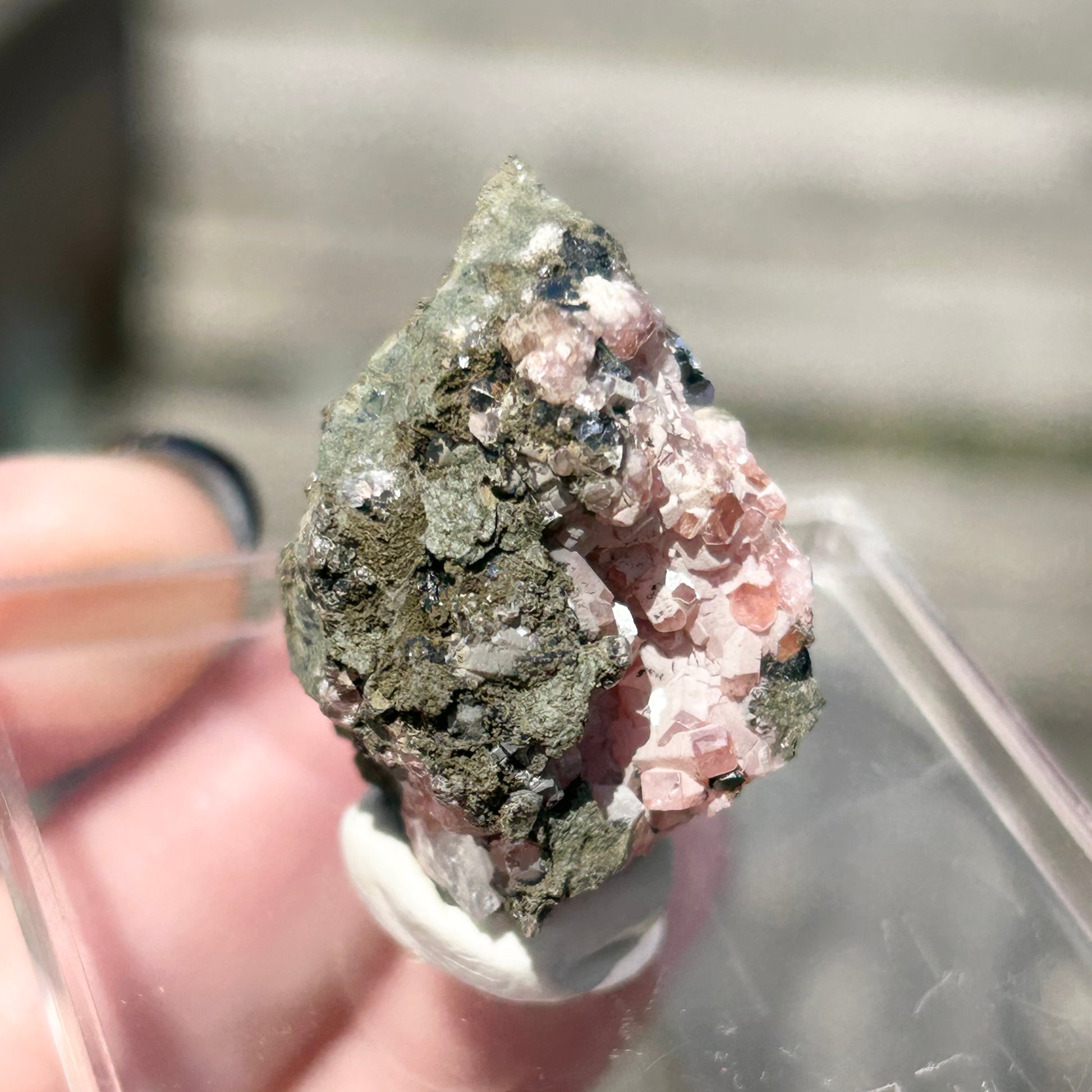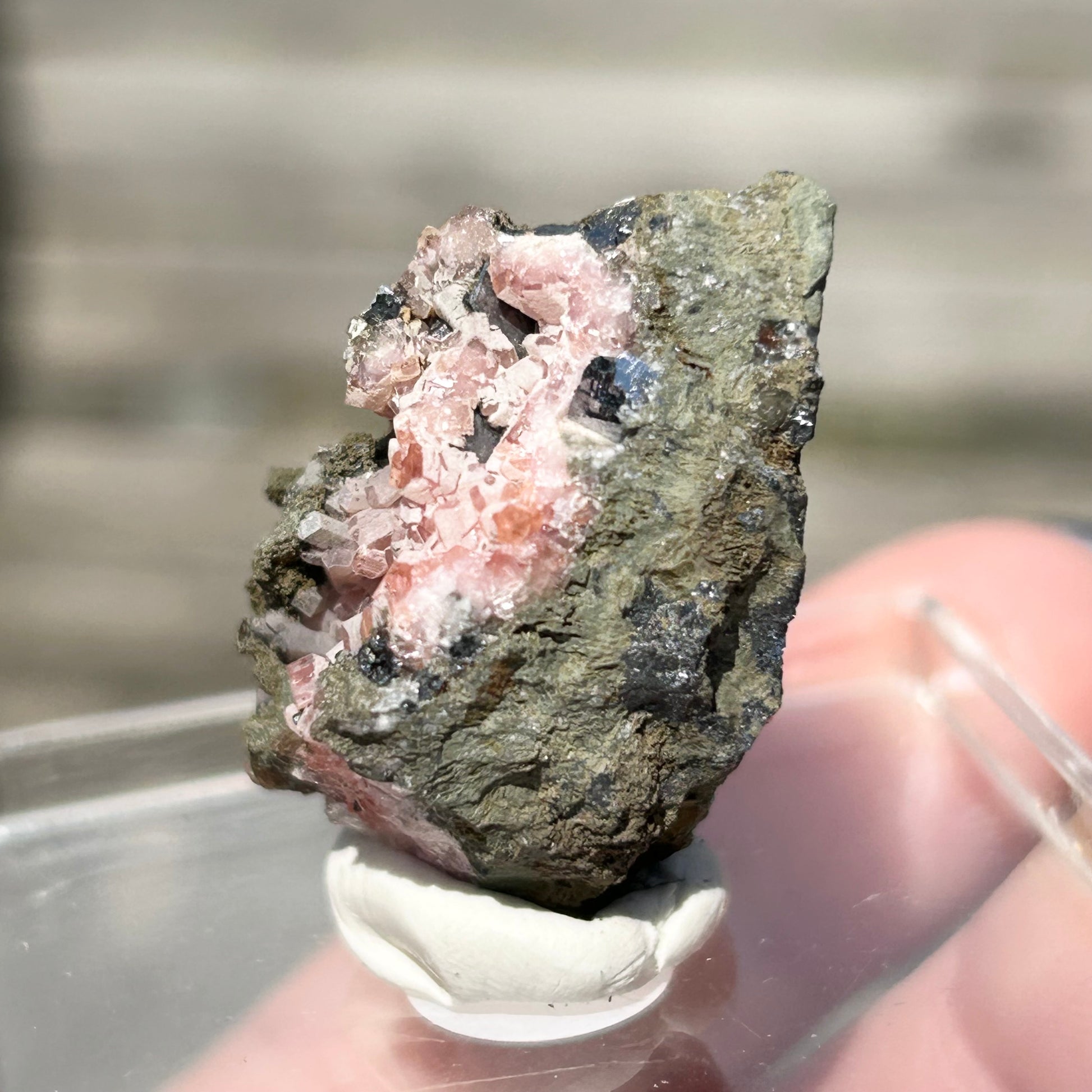 This specimen has Botryoidal Pink Rhodochrosite bubbles all over. This is a true collectors piece is supplied in a specimen box with information card.