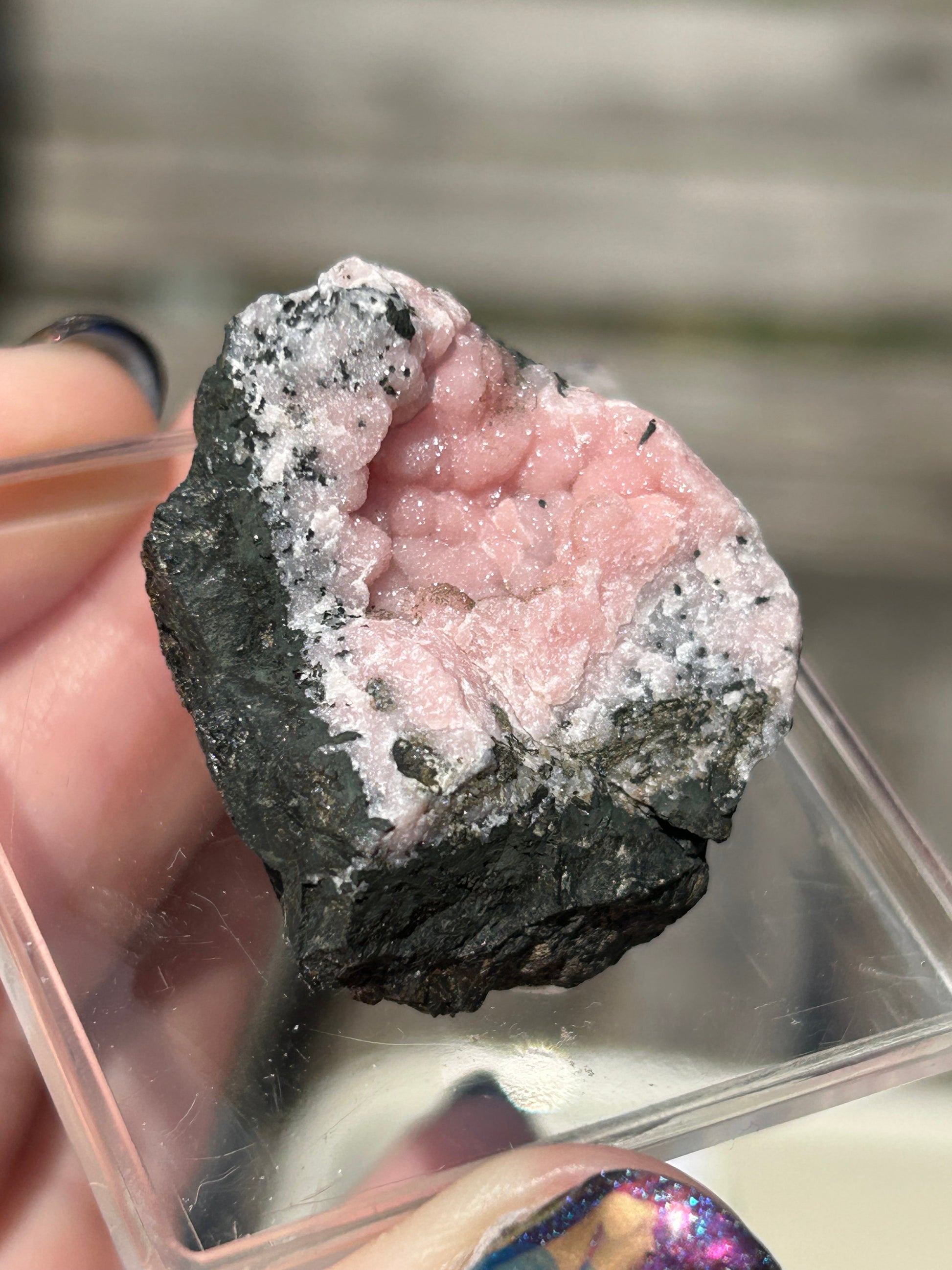 This specimen has Botryoidal Pink Rhodochrosite bubbles all over. This is a true collectors piece is supplied in a specimen box with information card.