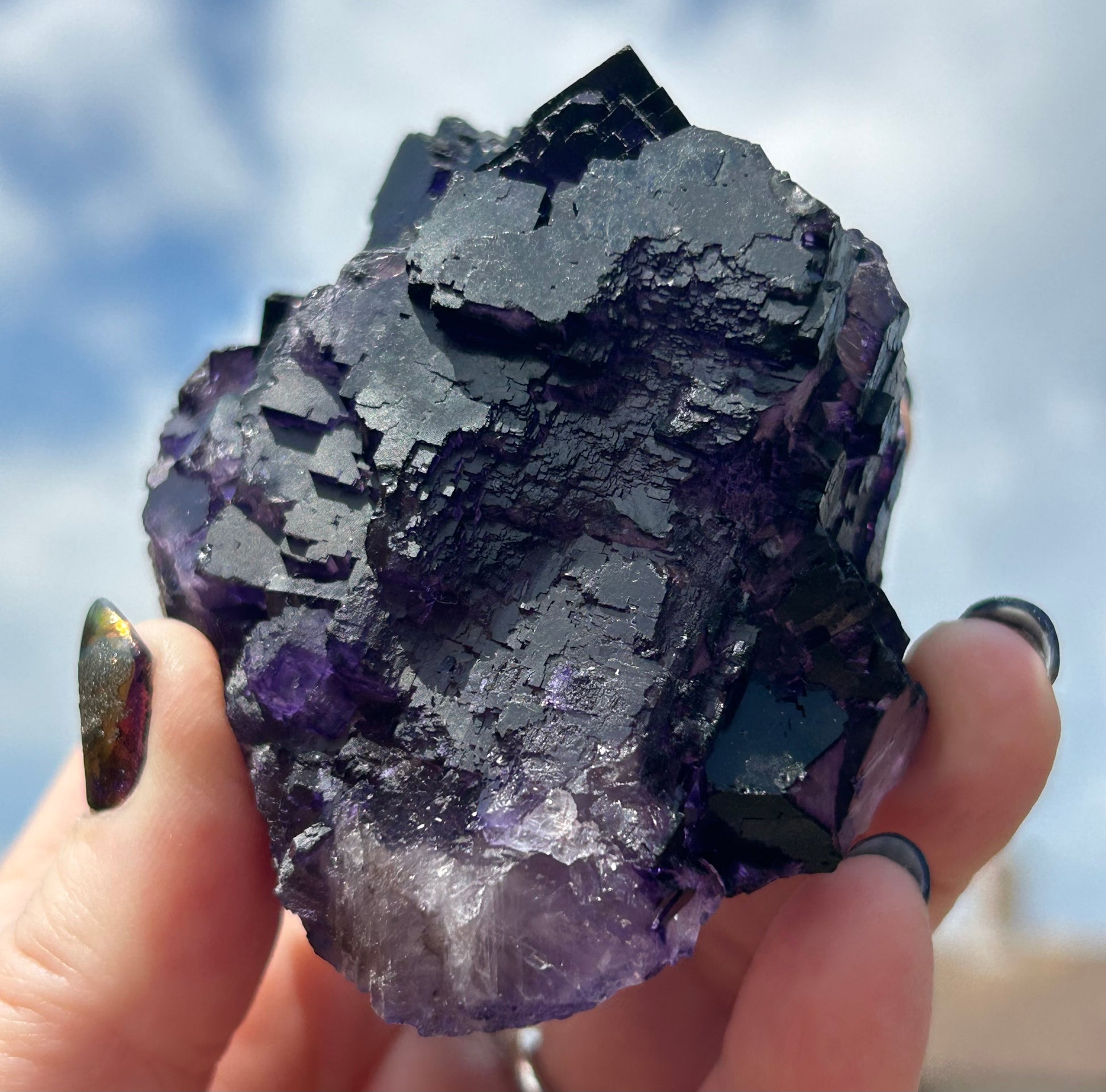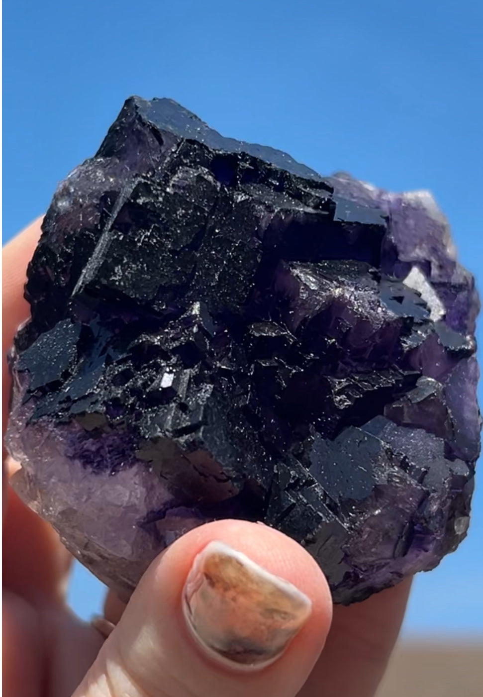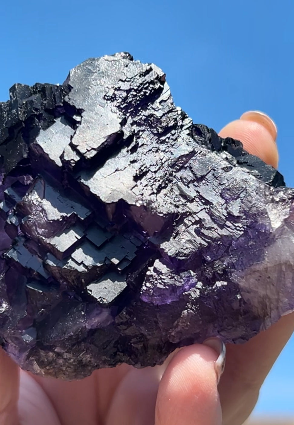 These truly beautiful Fluorites are from the La Encantada Mine, which is located next to the Tule Mine. They are white fluorite with a covering of deep purple on top. These specimens have an amazing appearance with the dark purple/ blue edge zoning shows as you turn it to the right angle.
