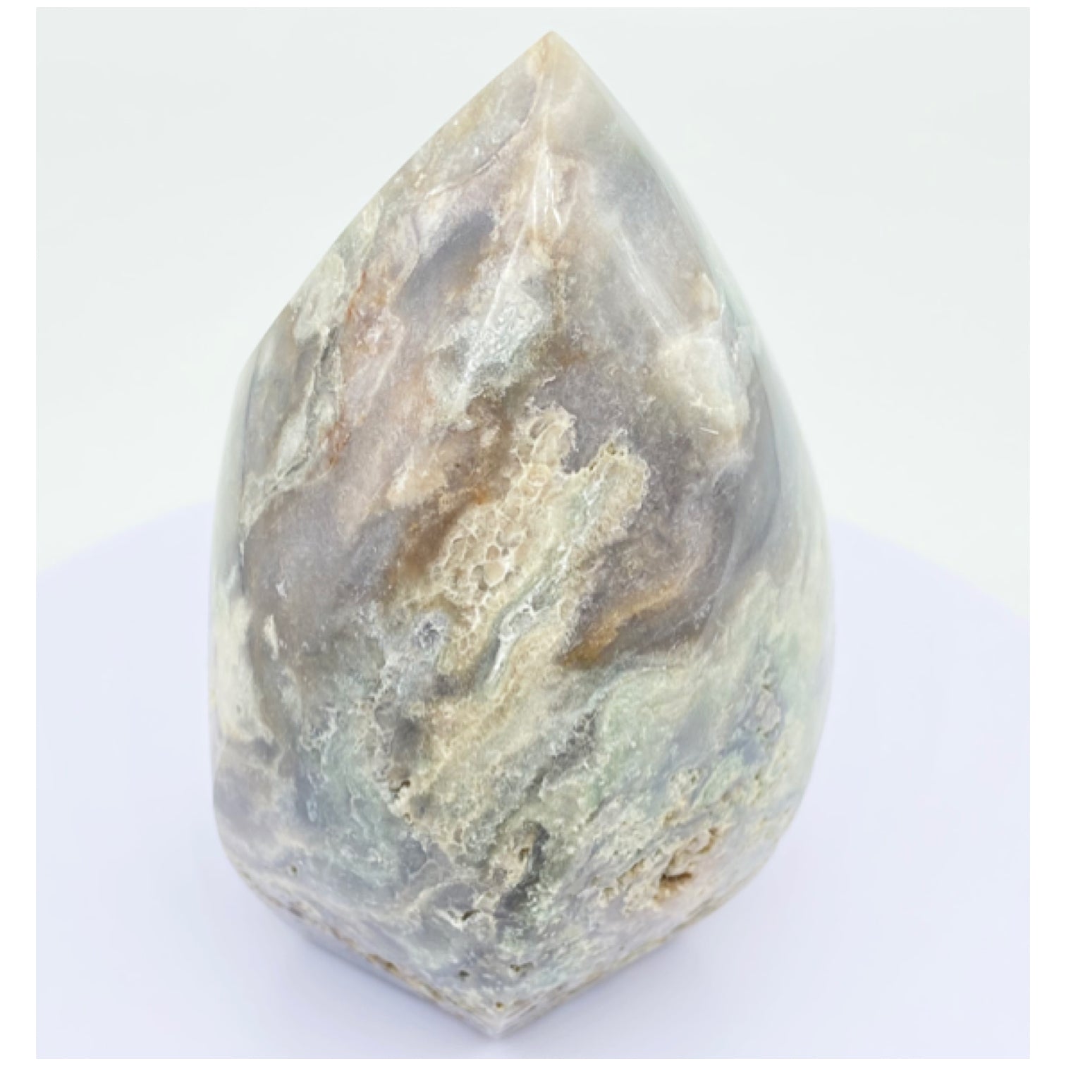 Polished Grape Agate Flame that has been Custom Cut for LCT. This flame displays sage greens, light blue , purple & white