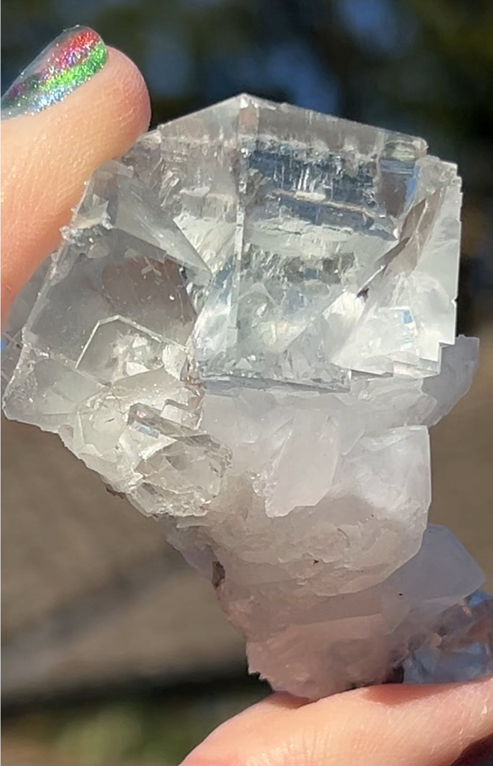 This aqua Fluorite specimen was one of four high quality specimens and this one reminds me of a bunch of Fluorite flowers on-top of Quartz. The main cube is 2.1 x 2.2 cm.